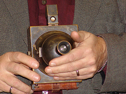 Bill Kantymir One more off the top 150 list This unusual plate camera was made in three sizes (one larger and one smaller than the examples shown here tonight) plus a stereo version. Bill's model is the earlier version with a separate viewfinder. It uses 6 x 12 plates and is equipped with an equally rare Krause-Zeiss f/8 120mm Anastigmat lens. Krause was one of a half dozen or so opticians licensed to manufacture Zeiss lenses. The Anastigmat was first made in 1890. A decade later Zeiss began using the name "Protar" for its lenses after an unsuccessful attempt to register "Anastigmat" as a trademark. All Photosphere cameras were constructed of metal-oxidized silver-plated brass and used a hemispherical guillotine shutter. The example Bill bought came with a viewfinder, ground glass, lens, leather case, and two plate holders. The shutter wasn't working, but his purchase included a second 6 x 12 Photosphere body with a working shutter but no plate holders, lens or viewfinder. The cameras were offered as a single lot in the recent Westlicht auction held in Austria. Visit their web site to view their illustrated catalogues. After hearing Robert Gutteridge's shipping tale. Bill felt it necessary to point out that he had his purchase shipped from Vienna by UPS. It took four days to arrive and cost him €110 plus GST and PST. A much faster service for somewhat less than twice the price Robert paid for delivery by sea. |