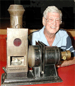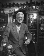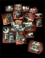 50 Years of CollectingLarry Boccioletti is a founding member of the PHSC. He has a broad experience in the photographic industry including operating his own studio, Dean of the New York Institute of Photography in NYC, and staff photographer for Dehavilland Aircraft. Since retiring, he has operated his own b&w darkroom, rented antique cameras, and enjoyed his collecting activities Larry started his career in Welland Ontario in the early 1950s. His interest in collecting was sparked by a local auctioneer. Visiting this customer, he spotted an odd looking gadget in the midst of a pile of junk. It turned out to be a Klito horizontal enlarger which the auctioneer gladly donated to Larry. The Klito was placed on display at the studio, and prompted a number of other donations from customers who remembered old cameras lying unused at home. His collection was up and running. Developing an interest in the history of the cameras he collected, Larry was fascinated by the steps taken by different makers to circumvent patents owned by the competition. He related a story about the enthusiasm of Kodak in the late 1800s protecting its patents while merrily violating those of other firms, a common practice in many industries (for details, track down a copy of Images & Enterprise by Reese Jenkins, published in 1975). Sources of old cameras were used camera shops, and pawn shops. Garage sales turned up very little and no one was holding fairs like we do today. Larry moved to New York City in the 1960s to become the Dean of the NY Institute of Photography. During his tenure he met a number of the collectors who established the Photographic Historical Society (of New York) in 1969. At an auction in 1970 he saw a Daguerreotype camera which he felt to be worth a $1,000 go for $2,700. A short time later he realized the auction price was a bargain since Daguerreotype cameras were so rare. In 1972 Larry returned home, settling in Toronto. His collection remained in boxes while he searched for a new home. He looked at dozens of houses including one which he described as derelict -- badly trashed inside. But it had a plate rail which caught his eye as an ideal spot to display some small cameras (visible in the b&w portrait). He bought the house on the spot and added heat and humidity controls to protect his collection -- the other restorations including a functioning darkroom came later. A few years ago, Larry took a new direction in photography -- renting vintage cameras to a movie production firm. Pleased with the outcome, he obtained a list of all current productions from the Toronto Film Office and faxed each one a notice that he rented vintage photographic equipment (he cautioned prospective entrepreneurs to carefully check all returned goods for damage -- sometimes the repairs generate more than the rental)! One property agent who rented from Larry offered to buy his collection. Larry turned him down -- at first. Eventually the agent opened his own business -- a hand prop shop (a business that rents any small hand held vintage prop). The owner explained to Larry that he had radios, lighters, jewellery, eye-glasses, typewriters, etc. but no cameras and wanted to rent some from Larry. They agreed to a 50-50 split of the rentals and Larry turned over about 100 Kodak folders and other inexpensive cameras. Three months later, Larry was astounded by the size of the cheque he received for his share of the rentals. This return, combined with the difficulties uninformed relatives face trying to sell their loved ones' collections, made him receptive to selling outright to the agent. Discussions continued for some time and Larry's price continued to go up -- he kept buying more collections. A deal was finally reached and upon payment of half the fee, the agent received 5 van loads of cameras and other goodies. It took three of them a week to inventory the collection -- 920 pieces to be identified, photographed (digitally and into the agents computer records), dated, and valued. Part of the agreement called for Larry to quit renting cameras for five years. However, the agent refused to sign the papers drawn up by Larry's lawyer because of a chattel mortgage clause. Larry decided to build another collection, this time with the more common cameras. Since the formal papers were left unsigned, Larry continued to rent from his new collection. The agent was furious at first, until he realized there was enough business for both. Today, Larry and the agent are on good terms and rent cameras from each other to meet commitments. A more detailed account of the program will appear in Photographic Canadiana. ABOUT THE IMAGES. Click on any image and in a few seconds you will see an enlarged view in a separate window. The formal portrait is courtesy of Robert Lansdale. The colour images were taken with a Nikon Coolpix 990 and adjusted in Photoshop. The montage images were shot from the screen during Larry's talk.