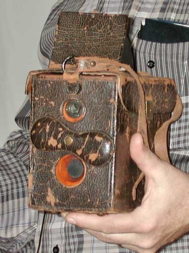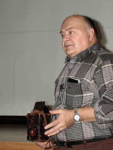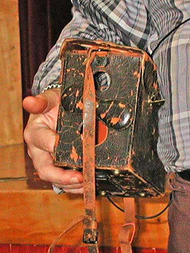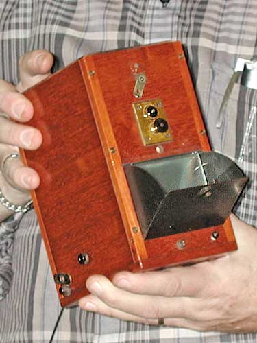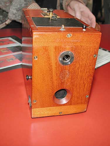 Bill Kanymir took the podium next, introducing a rare 1889 German detective camera. Dr. R. Krugener of Frankfurt, Germany made a number of especially well constructed cameras in the late 1800s. Three of these, including this ’Simplex Magazin Camera’ are described in Eaton Lothrop’s book ’A Century of Cameras’. (Eaton has been a member of the PHSC from time to time and was our guest speaker most recently in June, 1999).