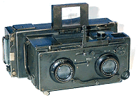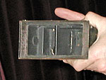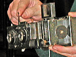 Robert Wilson was next with his - what else - demonstration of the c1934 French Ontoscope Stereo camera made by Cornu of Paris, France. This metal stereo camera could be quickly converted a panorama camera by shifting the lens assembly over, flipping up an alternative post for the sports finder, and moving the septum to the side. Bob was the successful bidder for this camera in the recent Shean mail auction. There will be an extensive coverage of this unusual camera in the next issue of Photographic Canadiana.
