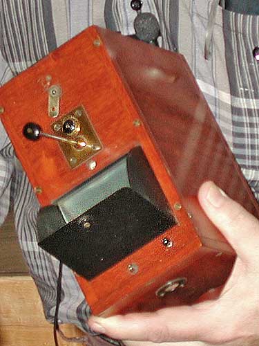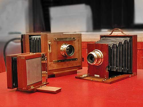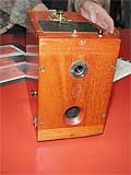 For the second camera, Ed found a Zeiss Tessar in his junk box along with a film pack holder with a wooden slide handle. He made a matching wooden back to hold the film pack, a paper bellows, and wooden guides for the sliding back and his second camera was finished.