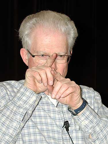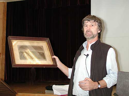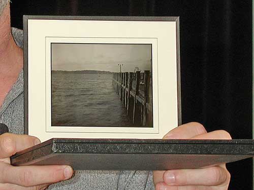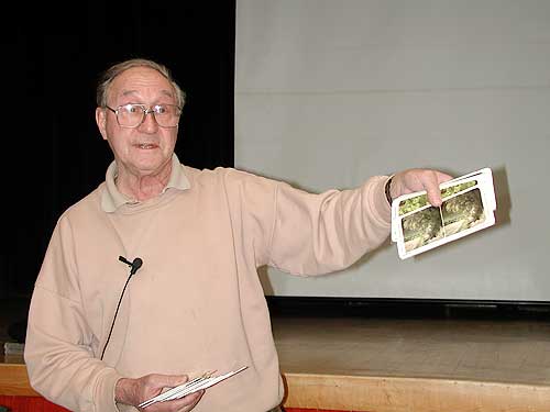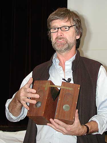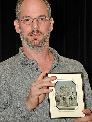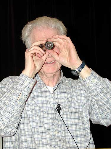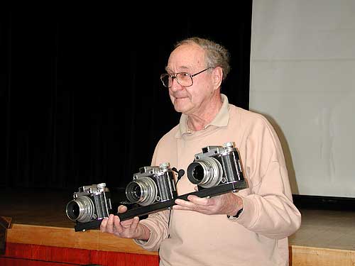 Stan White kicked the evening off with a lament on the difficulty of being creative today in traditional flat photography. Fortunately, stereo offers scope for innovation. Stan presented the first three-camera 3D system I've ever seen. Three Kodak Medalist medium format cameras on a yard stick long stereo-bar. Stan uses this gizmo to make infrared stereo landscapes. You may wonder about the middle camera since traditionally stereo is created by letting one's eyes and brain merge two slightly different views of a scene. This is the innovation: the middle camera uses colour film, not infrared film. The colour image is modified in Photoshop and layered on each of the infrared images to add back a sense of colour to Stan's strange ethereal views of the Southern Ontario countryside.