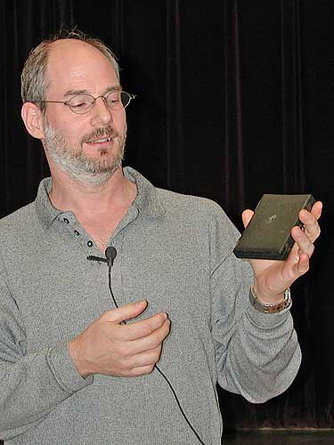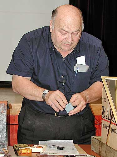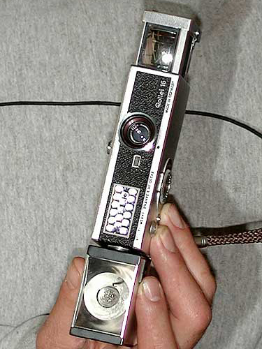 Mark Singer was surprised to learn that Rollei, famous for their quality twin-lens reflex cameras, made miniature cameras too. He brought along a Rollei-16 made in the mid 1960s. Its f/2.8 35mm Tessar lens took images 12x17 mm in size on 16mm film.