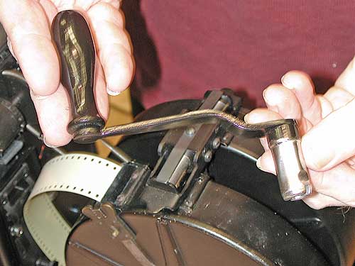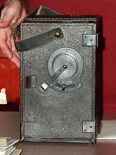 Robert Gutteridge, writer, teacher, and collector introduced us to the European movie camera for home movies. Pathé Frères manufactured these compact cameras which used a 28mm wide film. The negative film has squarish sprocket holes along each edge while the prints made for projection have only a third as many holes along one side so the film can only be threaded one way and cannot be confused with 35mm film stock. One design feature of the European cameras is the placement of the feed and take-up reels side by side. While this means a more complex threading path, it allows the designer to make a more compact unit.