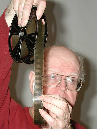 As a side note, Robert discussed the issue of nitrate film material vs. safety film. While nitrate-based film is very flammable, it can be safely stored in containers in a cool dry room if the containers are not air tight. Nitrate film became notorious in the early days when a temporary tent theatre went up in flames with loss of life. The actual cause of the accident was the careless use ether as an illumination fuel. The resulting fire ignited the nitrate film. The nitrate base was preferred to safety film because it resulted in a sharper image. The nitrate film was completely phased out by the 1950s. Projectors designed to run nitrate material had built-in fire extinguishers and steel shutters that closed when the film slowed on its way through the gate.