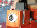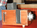 Home-made 4x5 CamerasA very small number of our members delight in making their own cameras. Ed Warner is one of this select group. The first camera he showed was a 4x5 SLR made from fine mahogany cut and hand planed by Ed to the desired thickness. The mirror is flipped up with a lever. Ed used a small magnet inside the camera to hold the mirror up for the exposure. He modified a film holder to make a ground glass used to accurately position the adjustable back for exact focus. To aid in focussing, Ed mounted a simple lens and rubber shade in a small wooden block which fits onto the viewing hood. The most expensive part of the camera is the lens with its built-in shutter. Other mechanical components came from Ed's junk box - the remains of various cameras and other instruments beyond repair. Having some wood left over, Ed made a companion 4x5 box camera following the traditional design and positioning of the shutter release and viewfinder. These cameras are both working examples of Ed's care and fine eye for construction projects. ABOUT THE IMAGES. Click on any image and in a few seconds you will see an enlarged view in a separate window. The images were taken with a Nikon 990 digital camera and modified as required in Photoshop. All images are © 2001 by the Photographic Historical Society of Canada and may be used if the source is mentioned.