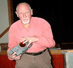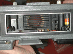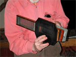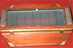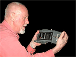 Ron brought a large wooden case filled with rugged pieces of metal and wood that turned out to be a special camera made for the U.S. Navy by the Russell Vought Division of the Solar Aircraft company. The camera is electrically controlled with a Venetian blind style shutter behind the lens. It takes 120 roll film (70mm) and produces four 2.25 x 7 inch negatives per roll. Ron's example is missing the lens which is usually a wide angle lens of about 120mm focal length. The camera uses a removable roll film back. A previous owner made a wooden holder and ground glass adapter to fit the back to a standard 5x7 view camera. Just after WWII Burke & James sold modified versions of this camera as a panorama camera. The modifications to the roll film back consisted of the addition of a small circular red window so the photographer could use the numbers printed on the paperbacked roll film to eliminate any gaps or overlaps while winding on the film. And a winder knob for manual transport of the film. ABOUT THE IMAGES. Click on any image and in a few seconds you will see an enlarged view in a separate window. The images were taken with a Nikon 990 digital camera and modified as required in Photoshop. All images are © 2001 by the Photographic Historical Society of Canada and may be used if the source is mentioned.
