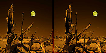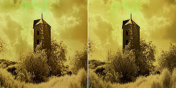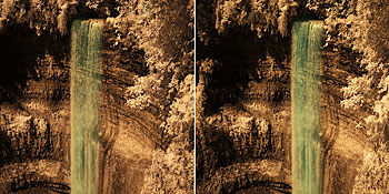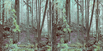 This page shows four stereo images recorded by Stan using a pair of Canon Digital Rebel cameras modified to record the near infrared instead of visible light. The two cameras had their IR blocking filter replaced by an IR passing/visble light blocking filter. The cameras are mounted on a stereo bar and images are captued on both cameras simultaneously allowing Stan to capture moving subjects such as the waterfall.