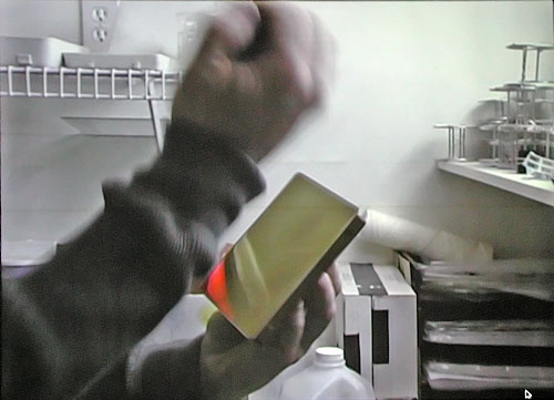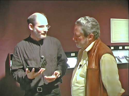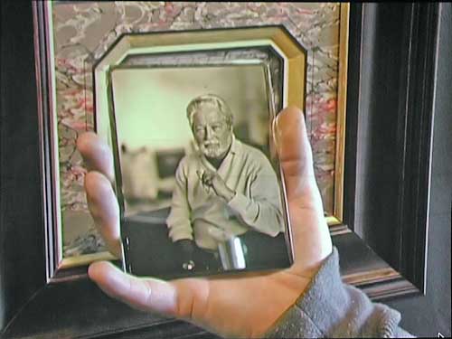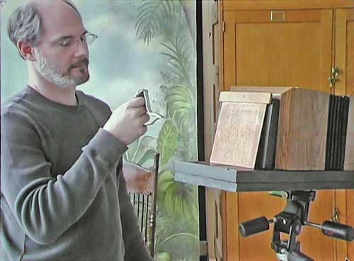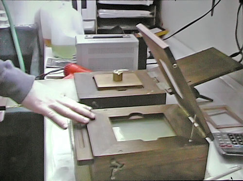 DAGS. There are only a half dozen active modern day daguerreotype photographers (those averaging one or more images a week). The materials are dangerous, the processes difficult and demanding, and each image takes time and skill to create. Mike uses a mix of antique apparatus and authentic reproductions he has made using patent drawings as a guide. His lens is a vintage f/3.3 optic (faster than a modern-day portrait lenses to accommodate the much less sensitive daguerreotype plate). It took him two years to complete and equip his studio and darkroom. He took an introductory daguerreotype workshop at George Eastman house to get started, then researched via books and the internet. Interpreting the ancient books and translating their contents into meaningful modern terms was most challenging. The interview with Reichmann began at the Ryerson Gallery in May 2004 during Robinson's "Contemporary Daguerreotypes" exhibit and then proceeded to his Century Darkroom studio where we see Reichmann posing for a portrait and watch Robinson step through the stages from making the sensitized plate to developing the latent image. |
