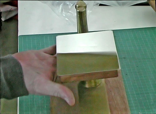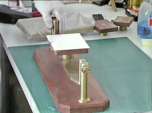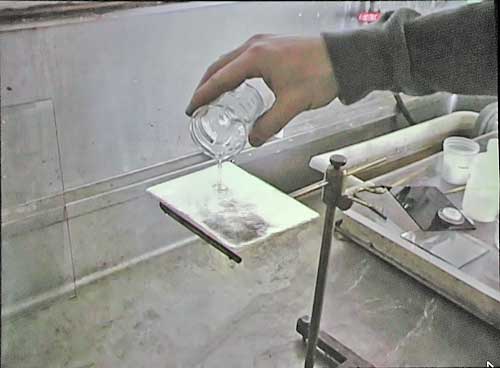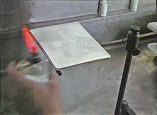 The buffed silver plate is sensitized by exposing it to iodine fumes. Image contrast depends on the thickness of this coating. Thicker gives higher sensitivity and lower contrast - like high-speed film - for use in outdoor light with its wide dynamic range. For studio use a thinner coating gives higher contrast and a punchier image at lower sensitivity. The plate changes colour as it becomes sensitized with a characteristic deep yellow signifying a fully sensitized plate (the iodine combines with the surface silver to make the light sensitive silver halides which underlie all silver-based processes). |