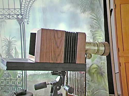 The gentle shades and luminosity of a daguerreotype are not attainable in any other medium. If properly sealed, a daguerreotype has a life of over a hundred years - witness the number of images surviving from the 1840s. A sitting takes three to four hours including processing. Robinson takes and processes three images, selecting the best for final casing and presentation. The rejects are polished and re-sensitized for later use. Such a sitting and image costs $750.00. Robinson's landscapes and still-life images, especially those hand coloured, can go for as much as $6,000 (authentic 19th century landscape daguerreotypes are very rare). While sensitized plates will last a day, exposed plates are very short-lived. They must be developed quickly after exposure before the latent image silently fades away -- no time for a leisurely walk back home to process after supper! |