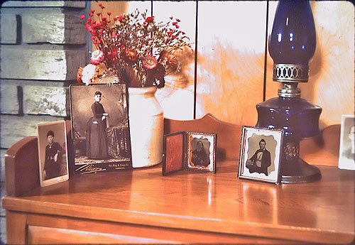 The American bicentennial in 1976 sparked the nostalgia for portraits in the style of a century earlier and studios sprung up specializing in such portraits down to the period backdrops and clothing. Well known local photographer Wayne Sproule, an early member of our society, was a fixture at the CNE taking "vintage likenesses". Gerry offered a similar service at the annual Markham fair using sepia-toned Polaroids and slip-on period clothing -- some made by wife Pauline. Gerry researched old books and pictures to get the correct costuming, back-drops, and poses. A rigid pose and a stern look matched the 1860s while umbrella lights and cloth filters mimicked the soft lighting of the day. |