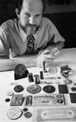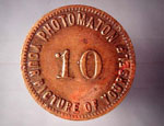 Retired Medical PhotographerPHOTOGRAPHIC NUMISMATICS. Nick combines two hobbies with his interest in coin collecting and photography. Coin collecting encompasses money and medals. His slide show covers many aspects of the tie-in between the image and the coin. Please note that these images are the property of Nick Graver and are not to be used without his permission. KODAK CANADA. Kodak struck medals to celebrate each of its International Salons. This one was for a show held in Canada. CHARLIE CHAPLIN. We all remember Charlie as the Little Tramp. This medal shows Charlie holding a movie camera. Hey Charlie! You're going to ruin your shots with that door open! DAGUERRE. Many medals were cast in memory of Louis Daguerre. This one by the PAA in 1889 celebrated the fiftieth anniversary of Daguerre's announcement of his photographic process. The image of the medal appears on the back of some carte de visite cards as part of the photographer's ad. PHOTOMATON. This illustration from a brochure on the automated snap shooter shows the workings of the device and sample results. Tokens were used to operate the machine. The example Nick showed is stamped with a 10, perhaps meaning 10 pictures, since stamping a face value on the token would defeat its purpose which was to separate the cost of the token/service from the actual token. If you have any questions, or wish to share any images or numismatic items, Nick would be pleased to here from you. His email address is: ngraver@rochester.rr.com. ABOUT THE IMAGES. Click on any image and in a few seconds you will see an enlarged view in a separate window. The images were taken with a Nikon Coolpix 990 digital camera and adjusted as necessary in Photoshop. Any blur or off colour images are due to my casual snaps from the screen as Nick conducted his talk.