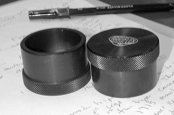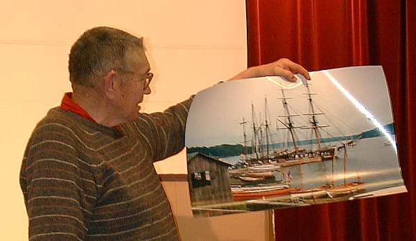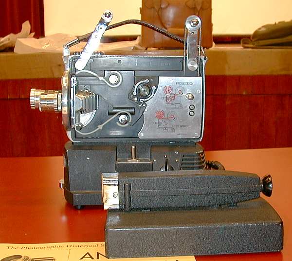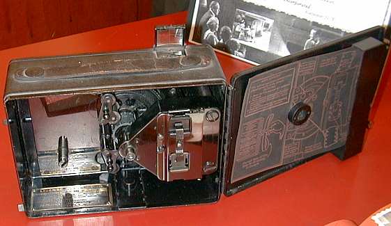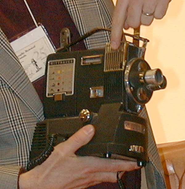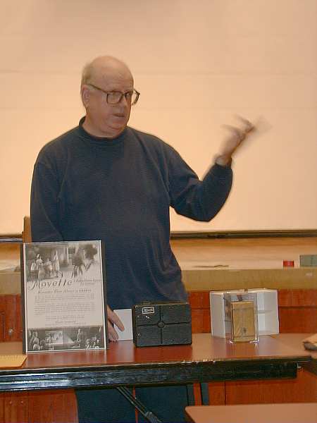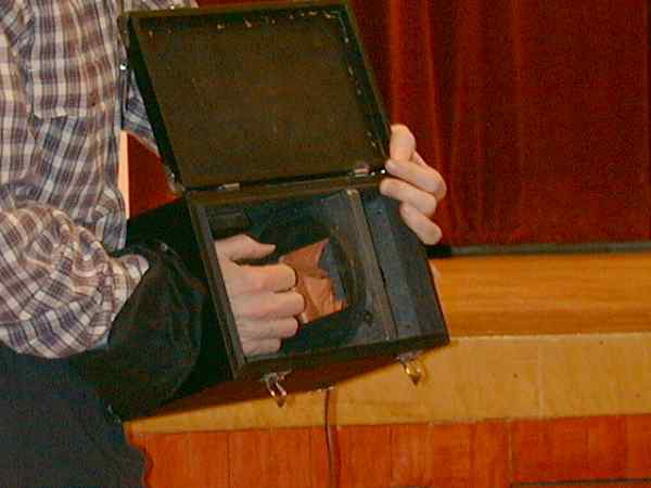 Syd Sobel kicked the evening off with an anecdote about modern cameras with auto features and tied the modern day cameras to the old with accessories of yesterday which enhanced his 50 year old Leica IIIc . Flash synchronization was added to this camera courtesy of Geiss and its little two part external sync and connector mechanism. Metering, with a bit of calculation was provided by a Kopil meter. A Leica 9cm or 13.5cm lens could be added to the Kopil meter to transform it into a modern day spot meter. John Linsky always finds the unusual and tonight was no different. He brought along a Thompson tintype camera c1915 with typed instruction sheet and catalogue (lens 50 cents extra). The camera uses a version of the Kerr bottle and a mono bath process to create a bleached positive tintype on the spot while the itinerant photographer's customer waited. Robert Gutteridge showed a rare Movette 17.5mm film amateur motion picture system. It cost $150 in 1917 for camera, projector, tripod and film. It was hand cranked (no spring with an awkwardly placed handle which made it impractical to attempt hand held shots. Each cycle of the crank was one frame so the average scene was shot at 16 cranks per second. A simple Newtonian viewfinder was used to frame the scene. The camera was the first amateur camera with a magazine load. The film was nitrate based B&W non-reversible (you developed the negative film then printed to get a positive). Being nitrate based, examples of the magazine, which Robert displayed are even harder to find than the camera! The system was killed by the Pathé 9.5 (Europe) and Kodak, B&H, 16mm (America) cameras which used reversible film for cheaper operation. The awkward crank position was due to placement of the magazine beside the shutter mechanism resulting in an awkward flipping of the film to cross the gate at right angles to the magazine. Les Jones showed a recently published Canadian soccer history which used old images including some from member collections. Les announced a database of old images was being assembled for use in similar projects and he encouraged all image collectors to have their old image collections listed for use in publications. Stan White brought a selection of modern amateur stereo imagery including a selection of Christmas cards he has received over the years. Ev Roseborough reminded us that some very complex lenses are used in microscopy. Ev passed around a forty power flat field highly corrected plan-apochromatic microscope objective plus a large scale cross section diagram showing the complex profusion of lenses stacked up inside the 35mm cassette sized barrel, including a pin head size front lens element. Bob Wilson passed around Arriflex caps and was seeking opinions about their purpose ( consensus was that they were dust covers to protect part of the camera mechanism. Bob also showed a rare Wittnauer Cine-Twin combination 8mm camera and projector made by the famous watch company for sale only through jewellery shops. The product was a dud and disappeared a year after it was introduced in 1957. Fred Hunt told us some tales about the days of tall ships along with images he shot at a Georgian Bay Tall Ships ceremony which celebrated the completion of the replicated HMS Tecumseh which was warranted by the Queen in 1990. Dr Tom Spalding a Royal Navy doctor training at the Arthritis and Orthopedic Hospital on Wellesley represented the Queen. Fred wrapped up by showing us an original MacAskill image bought after a no bid at a Toronto Camera Club auction. Ron Anger brought a small telescope/ transit affair made by Realist, the 3-D camera folk. No one could suggest its use for certain. Bob Lansdale showed two old brass barrel lenses engraved with the name of a photographic dealer on Bay Street, Toronto, Ontario (F. A. Mulholland & Co.). The lens shown below is a 15 inch "Lightning" Rapid Rectilinear f/8 to f/64. If you have other examples of Canadian Lenses, please get in touch with Bob at bob.lansdale@1staccess.ca. Bob wants other examples for a forthcoming Photographic Canadiana article. Our wrap up speaker was program director Mike Robinson. Mike brought along his working reproduction of an E & H T Anthony 1848 chamfered daguerreotype camera. Mike made the camera from photos and precise measurements of the original. He included the interior sliding box which permits a range of settings from portrait to close up and added a c1861 Petzval portrait lens by Voigtlander. Mike pointed out that this lens at its infinity setting actually focuses at infinity on the camera attesting to the precision of the lens and the original camera construction. Mike noted the chemical vs. visual lens settings vary by a small fraction of an inch (caused by the sensitivity of the plate to blue light vs. the eye’s broader sensitivity and the imperfect correction of lens from that era. The images on this page were taken with a Nikon Coolpix 900s digital camera directly from the screen during the video. As a result, while the images are acceptable on the web, they are not suitable for printing. I did considerable adjustment to the images to compensate for a combination of the slow speed of the camera and the quality of the video image. The darkroom I use is Corel Photo-Paint, a very able competitor to Adobe Photoshop. Its a pleasure to be able to adjust the image parameters and see the effect instantly on screen. Click on any of the thumbnails at the right, to bring up a larger version of the photo. Use your browser's back arrow to return to this page.
