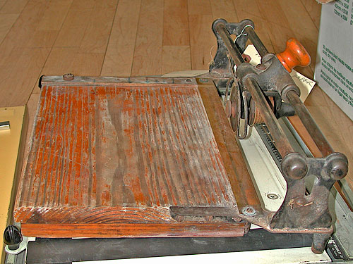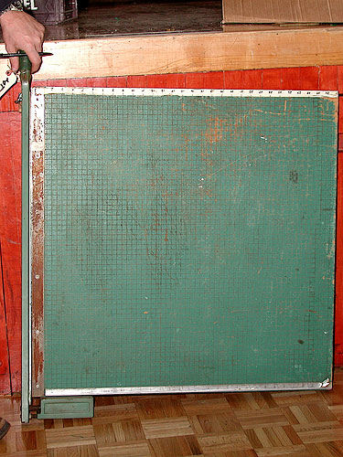Shown at right is a traditional guillotine style cutting board, only this one is "super sized" to handle really large prints. In the 1960s I worked in a Bell Canada training centre in Montreal. A polite caution was added to our much smaller guillotine by one of the staff: "Please do not litter the floor with your fingers". A timely warning indeed when using these devices.