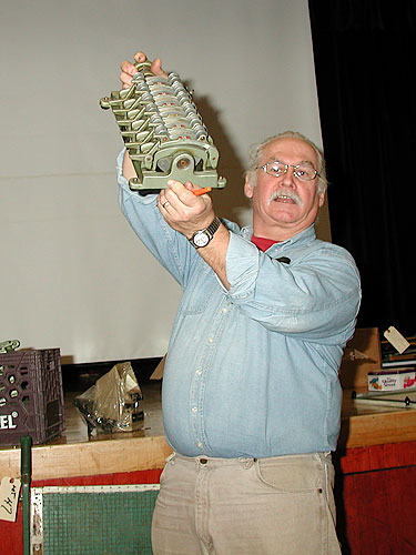 Shown at left, Ed Warner holds up a movie film counter gadget used by film editors to find scenes in a film strip.