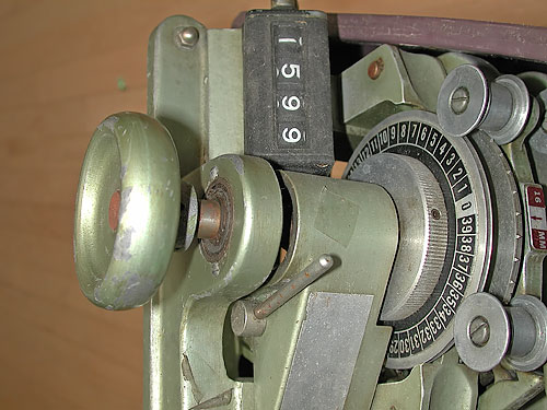 Some close-up shots of the film counter held up by Ed Warner in the first picture on this page. Built like a tank. If you look at the words cast into the crank portion at the far left, they say "Moviola Co. Hollywood California". It's an interesting display even if you never need to zip along a 'rush' film strip and find a scene for editing.