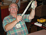 The lots were carefully laid out around the hall and grouped by a colour code. Periodically Ed would begin a countdown for a particular group of lots and at the designated time bidding stopped and the winners were declared. In between countdowns the members socialized and bartered with the folks who brought items to buy and trade at the back of the hall. No ticket, no bidding. Bidders registered with Ed who gave each one a serialized ticket. To bid, an amount and the ticket number were written on the page beneath the article. Bids were raised from time time to time as the Gralab measured it's way to the close of bidding. No, that's not a bid. Hand bidding as demonstrated by Mike Klatt was not permitted. Ed did have to remind participants from time to time that they had to register and record a bid, not wait for the auction to "start". A lull in the bidding. We had time to chat about finds and discoveries since our last meeting back in June and to check out what Mo, Bill, Shelton, Larry and some others had brought for sale and show. A satisfied winner. John is passing the paperwork over to Ed after successfully bidding on an item. Wow!, he did win the bid! Ron and Bill look a bit surprised at John's successful bid -- perhaps thinking they missed a bargain this time... Checking book value. Or just checking a book? In the background Two Roberts are chatting - likely about an article for the next Journal. Parts of the image are fuzzy due to a shutter speed of 2 seconds by room light (1.94 seconds according to the record kept by the camera). A Wonderful old Exakta. My first quality camera was an Exakta VXIIa purchased new in the late 1950s at a time when they were priced higher than a Leica. This pre war model looked to be in very fine condition. Take a closer look. One of the reasons I bought my first Exakta was for its ability to take close up pictures using extension rings and the through the lens viewfinder. I took this shot to show off the ability of the 990 to do close ups too. The detail at full resolution is remarkable. Hopefully in a few years, when fast Internet access becomes common, we can display pictures like this at their full resolution. Exakta Telephoto. The early telephoto lenses were quite good. It was much easier to design a tele lens than a "normal" or wide angle lens. Did you know even the "normal" lens was special on an Exakta (retro-focus) due to its long lens to film distance to accommodate the mirror movement? 55mm and 58mm "normal lens" were quite common vs the 50mm "normal" lens on the Leica and other rangefinder cameras. I had one of those... This is how the lots were spread out for easy access. Can't you just picture Sam down at the end saying "I had one of those". Hey! There's a bargain. All items in the auction received careful scrutiny by the bidders. Some adding to their store of information, others reminiscing, and others deciding to bid or raise their bid. Checking it out. Every item received a careful inspection from prospective bidders. All in a row. You can see Ed's fine hand work here Each Item carefully tagged with a clearly visible lot number and a colour dot which signified which group it belonged to for closing the bids. Balda folder and box. And finally, a picture of the little Balda folder, complete with its original box taking us back to the days when inexpensive quality cameras usually came from Germany, and everyone was hopping on the 35mm "minicam" bandwagon of the late 1930s. Bill Mair. The cameras and other photographic items sold this summer and at the silent auction in September 2000 are from the fine collection assembled by the late Bill Mair. A friend and long time member of the PHSC, and Zeiss Historical Society, Bill is missed by his many friends. Those of us in the PHSC were very pleased to help Bill's family by managing the sale of his collection on behalf of his estate.