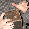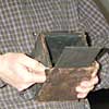 John's next item was a box camera discovered in an antique shop while on holiday. The shop had no cameras on display but the owner pointed John to a shelf at the back of the room lined with various box cameras including this one with its rather shabby leather covering. It turned out to be a unique 1896 quadruple plate box camera. Ed Warner made a latch pin and plate key to restore the camera to operation. The special feature of this camera is the fact it holds four plates. A key is used to swing a plate into the focal plane and a picture is snapped. The plate is moved back to the side of the camera and a second plate is rotated into the focal plane and so on for four shots. John chose to leave the leather as is rather than trying to clean it up and possibly lowering its value. |