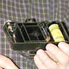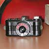 John's final favourite was a camera made only in 1956 - the Cambinox. It consists of a pair of 7x35 binoculars with a 16mm still camera nestled between the two objectives. The camera was originally purchased by member Walter Kopacs from Kling Photo in Toronto and is complete with the hard to find special film cassette. The Cambinox has interchangeable telephoto lenses with a choice of four focal lengths from 35mm to 180mm. The camera was made in Wedel, Germany by J.D. Moller Optical Works. |