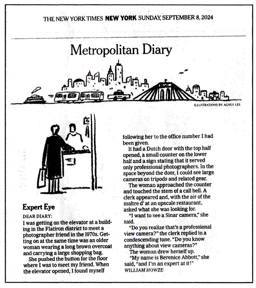 Toronto. My good friend George Dunbar dropped me a letter the other day. Enclosed was an anecdote about Berenice Abbott, a famous NYC photographer. I first learned of her impressive photographs as a subscriber to the original “LIFE LIBRARY of PHOTOGRAPHY“. This anecdote was in the NY Times Sunday, September 8, 2024 column “Metropolitan Diary” as reproduced below.