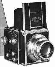 Around 1935, Bentzin developed the “cube with a lens” idea as a roll film SLR called the Primarflex. After 18 years, only about 12,000 cameras were made. The line was dropped in 1953. During production the camera had many names depending in part on the distributor, and numerous redesigns. This ad shows about the last redesign when the marque was updated after WW2. By this time, in appearance at least, the camera looked like an early Hasselblad.