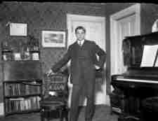 The photograph at left of the young fellow in my dry plate seems to have been taken some 125 years ago (give or take). The shadow he casts suggests a flash exposure, but the room illumination suggests it’s fill flash. The room’s wall paper and furnishings shout out Victorian era. The negative shows no sign of retouching to modify its contrast. There is no signs of electricity here. The piano suggests a degree of prosperity, as does the diploma on the wall. Where was the house? What did the young man do with his life? Did he Prosper? Go to University? Enter a profession? What was his name?