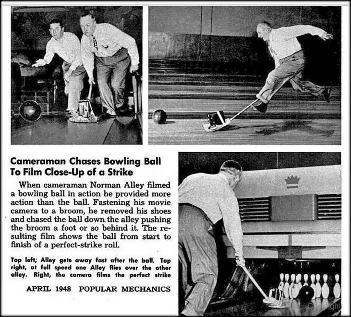 George has been a movie/video photographer ever since he was a kid. He writes, “Here’s an inventive cameraman filming a strike at a bowling alley in 1948.