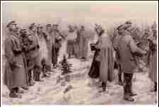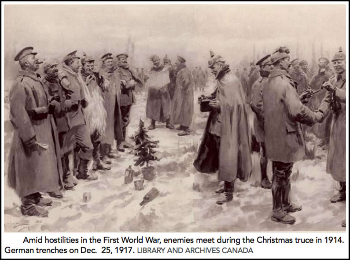 It shows the two sides in WW1 taking a break and celebrating Christmas together. One soldier is taking a photo of friends and the opposition troops.