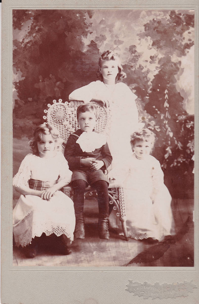 The cabinet card shown here was printed c1885 in Harriston, Ontario (about an hour north-west of Toronto). While the glass plate in the studio may have been correctly exposed, developed, and printed, today it shows washed-out highlights. If the subjects survived the vicissitudes of childhood and early youth and married, they could be the great- or great-great-grandparents of today’s people.