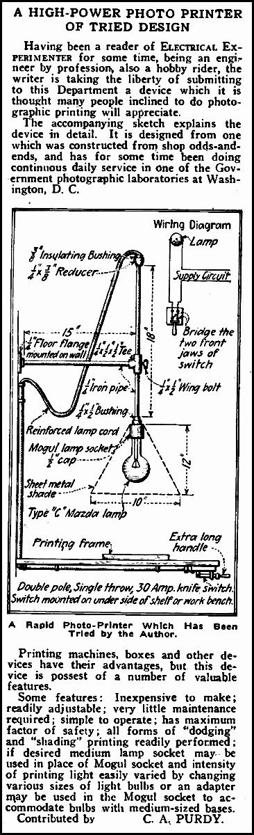 In 1920, a popular American magazine was called “Electrical Experimenter“. Its editor was Hugo Gernsback. While mainly devoted to radio (wireless) and electricity, amongst the January 1920 articles was a photographic piece on page 904 showing how the relatively new electric lighting could be used to contact print indoors. Space between the light bulb and printing frame could allow a degree of dodging and burning if needed. I am surprised that the DPST (double-pole, single throw) knife switch under the shelf didn’t accidentally electrocute the photographer!