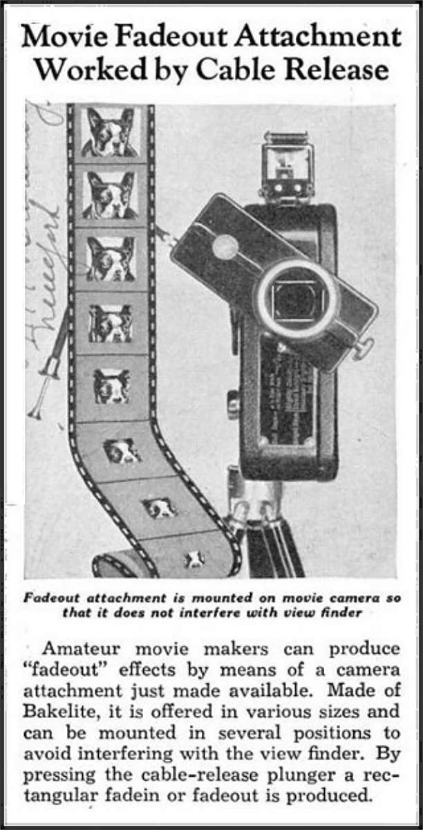 Toronto. Earlier this year we discussed movie fades in relation to a polarizing filter set that could be affixed to many movie lenses for 8mm or 16mm cameras (a May 1940 article). A few month earlier, in October, 1939 another device was announced for use on most movie cameras. This gizmo was slowly closed with a cable release to do a fadein and reversed by slowly easing the release.