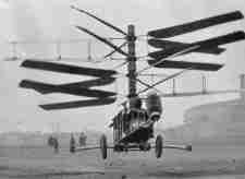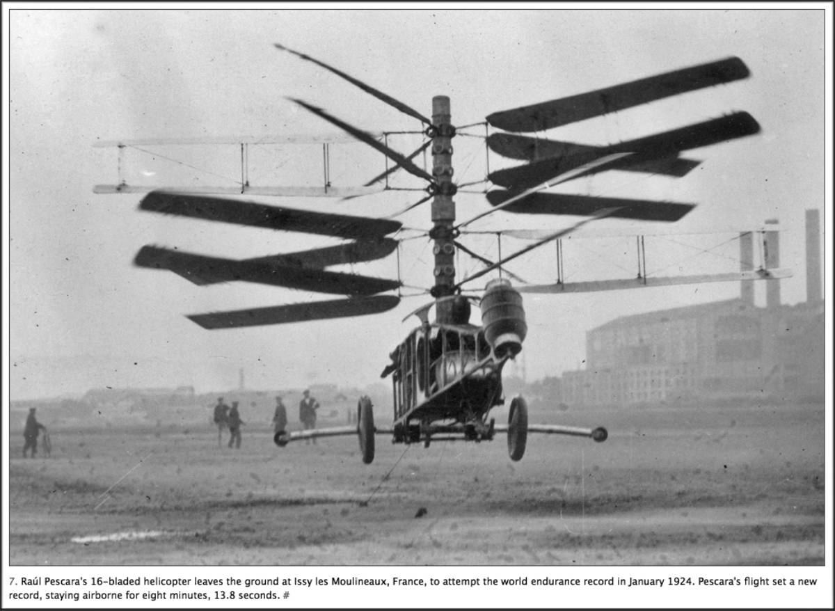 Toronto. The cut line for the photograph at left says, ” Raúl Pescara’s 16-bladed helicopter leaves the ground at Issy les Moulineaux, France, to attempt the world endurance record in January 1924. Pescara’s flight set a new record, staying airborne for eight minutes, 13.8 seconds.”