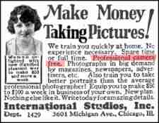 Nothing is free. Companies like this made their money by selling the naive and gullible wanna be’s instructions. In this ad, the make and details of the free “professional camera” were purposely left unstated so the reader could  dream about this potential bargain. Sadly, the profession of photography took (and takes) SKILL, especially in 1925. A very intelligent person could learn the art free by visiting his local library and borrowing the photography books of the day. He would still need to have good salesmanship and business acumen to succeed – tough to get by answering an ad.