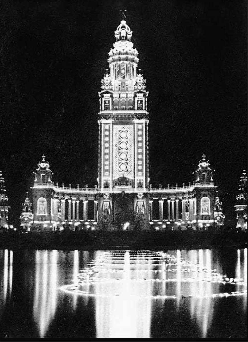 “The key attraction to that fair was the use of electric lighting to illuminate and outline the many sculpted buildings that were soon to disappear after the final closing. The public was awed by the magnificence and beauty of the scenes that were doubled by the reflecting pools and bolstered by the rainbow colouring of the buildings.