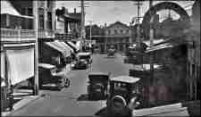 Typical of their holdings is the photograph at left which it is one half a stereo pair. It shows a typical downtown scene c1925. See the (today) old automobiles with nary a horse in sight. The local Drug store touts its stock of cigars – and Kodaks (not cameras). Down the street is another sign stating “Telephone” where the majority of folk could use the instrument, or even buy a personal line. Lots of awnings to fend off the heat of the sun.