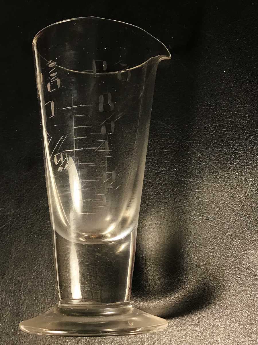 On my various routes, I would visit small drug stores to see if they had any scales or mixing and measuring vessels I could purchase (graduates ). At left is one sample of a small graduate I bought to add a bit of water or other fluid to a 16oz or 20oz graduate used for stirring (in the days when we used Imperial measure).