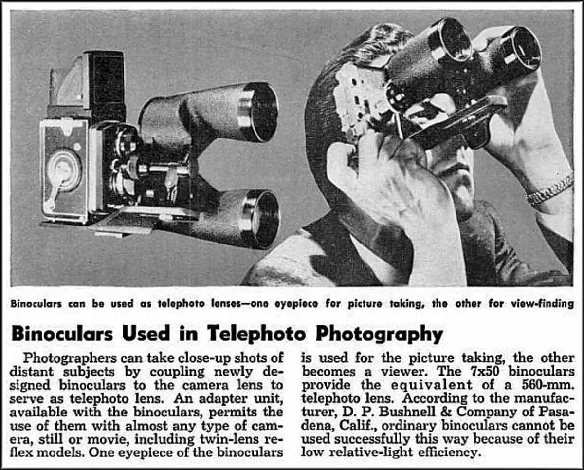 The article notes how the binoculars can be attached to a camera as a telephoto lens creating a ‘560mm’ equivalent lens. The article states that “ordinary binoculars cannot be used because of their low relative-light efficiency”.