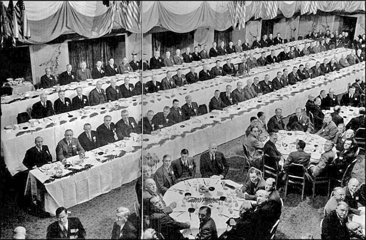 Sometimes a stairway was used to ensure everyone in the group could see the camera and be seen. Our late editor, Bob Lansdale, himself a professional photographer, made use of stairways in this manner. Or a high elevation for the photographer might work as shown in the LIFE photograph at left of the 1943 NAM meeting.