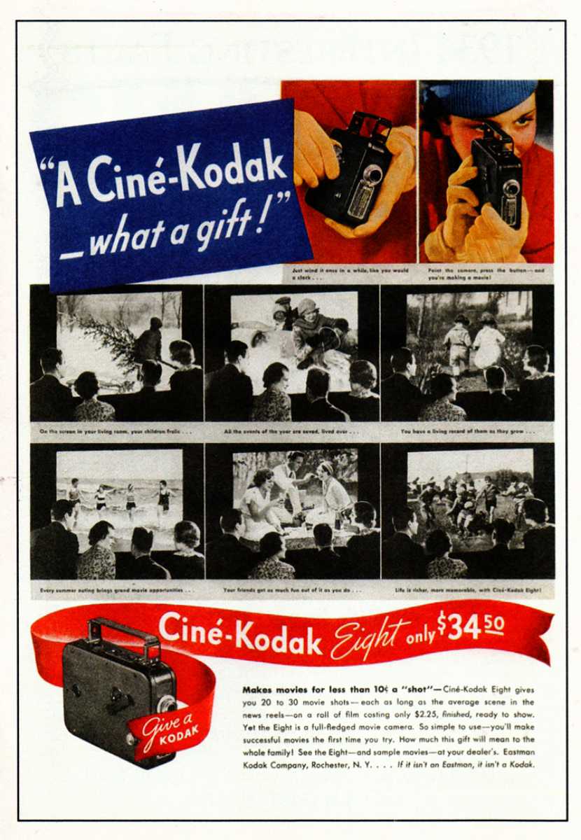 Toronto. Take for example the camera in this 1934 advertisement. Two years earlier in 1932, Kodak began marketing a new smaller film format for the family ‘movie’ photographer starting out during the great depression when money and jobs were so scarce – the 8mm film.