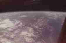 “The malfunction of his spacecraft’s automatic control system during the second orbit limited Glenn’s opportunities to make use of his camera. Nevertheless, he did manage to document his time in space and snapped this view looking northwest of the cloud-covered Atlantic Ocean on the third orbit of Friendship 7. Over the Atlantic on the third orbit, Glenn photographed an overcast region to the northwest and patterns of scattered clouds in the foreground.”
