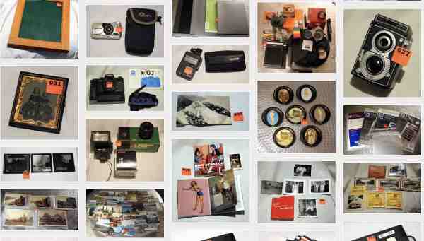 LOT SLIDE SHOW: We owe Clint a big thank you for photographing these lots, naming all lots by lot number and tagging them. The first batch (shown here) was uploaded May 1st. Another six (total now 77) photos added May 3rd and later on the 3rd another 15 for 92 lots on display. And still later the 3rd, another 13 added for 105 lots shown. A final batch of 30 photos (mostly Kodaks) were just posted bringing the total to 135 lot examples. Click on the montage above, then on the gorgeous old red Leica Manual (lot 001), and then on any lot icon to see the item larger.