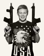 “Laurent Elie Badessi’s straightforward black and white portrait of a 16-year-old Texan youth, George, grinning widely as he holds up two automatic weapons more suited to armed combat than hunting, is shocking only in its brazenness. It is as American in its warped way as the proverbial apple pie.”