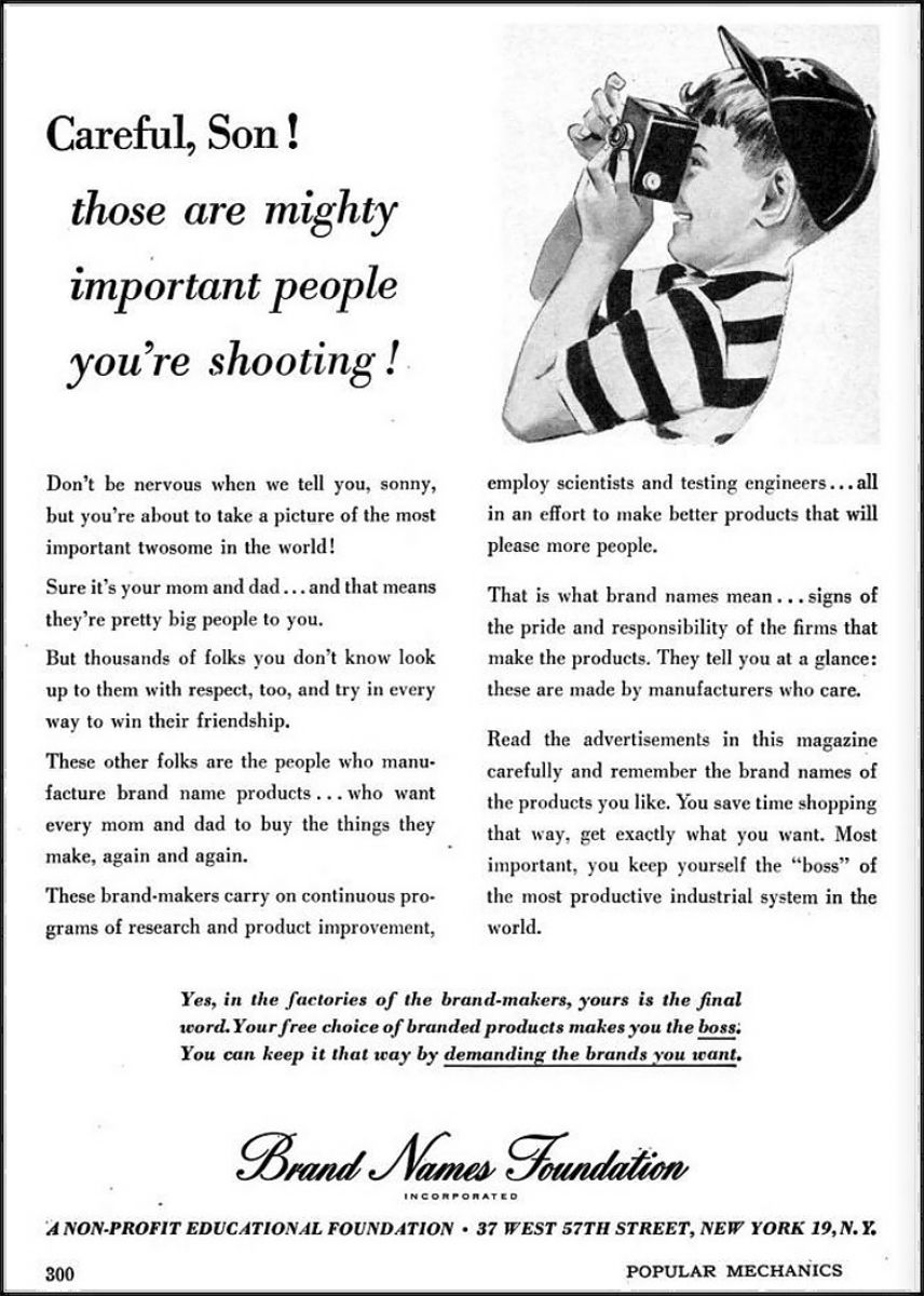 Toronto. A brand name denotes the style and quality of a company’s products. Post war, an American foundation was incorporated to promote national or international names over small local firms. The foundation was called, “Brand Names Foundation, Inc.” and was discussed in the book “Advertising in the Age of Persuasion” , a brief précis of which is cited in the above link. The book evolved from a CBC series by Terry O’Reilly which I listened to a few years back,