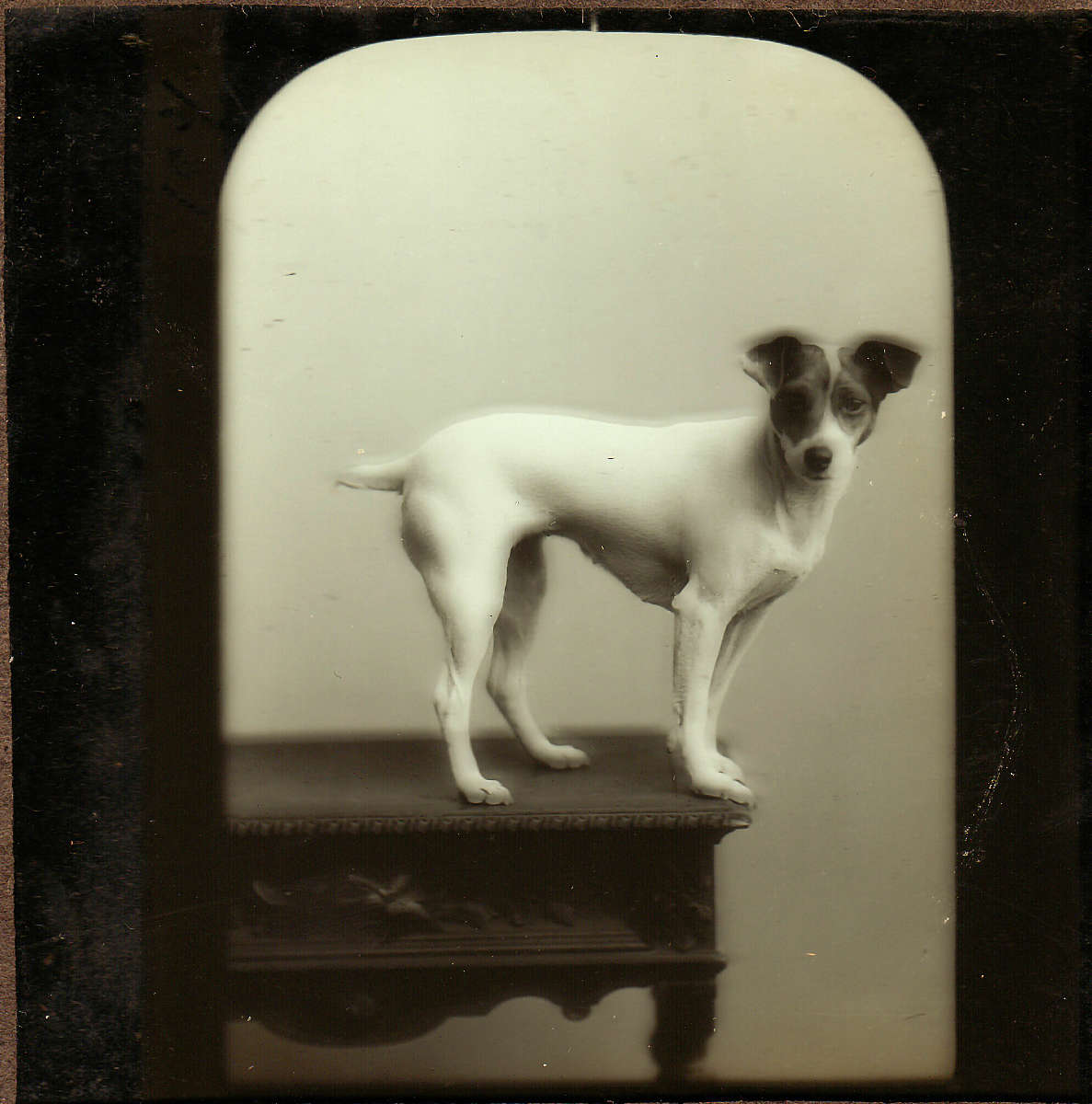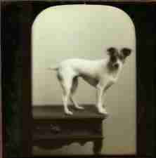 a glass slide of a dog (terrier) taken in Bath, England by a George Bath c1920s or 1930s
