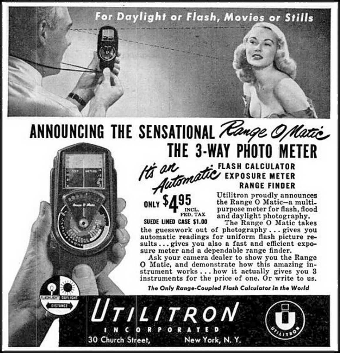 Utilitron, the maker of the “Range O Matic” is careful to state only the attributes of the gadget and let the reader’s imagination fill in the blanks. At $4.95 including tax, the company aimed at the bargain hunters in the would-be photographers’ fraternity. It cost much less than any one of the three instruments it was said to replace.