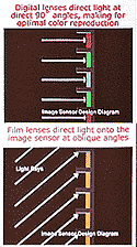 Lens Compatibility. Can we expect the sensor to reach a standard size matching the size of a 35mm negative, allowing traditional 35mm lenses to be used on the DSLR?. This may not happen. The sensor is a three dimensional device -- picture an array of tiny deep cells collecting light 'particles'. If the light hitting the sensor is not a parallel beam, the cells at the edges will receive proportionally less light than the centre cells. To avoid this falloff, a digital camera lens is designed to produce light rays that are parallel to the lens axis. Film being flat, the usual spread of the rays in a traditional lens has little effect on the evenness of light hitting the film. Since the sensors are an integral part of the camera unlike film, there isn’t the same need for standardization. The current crop of DSLRs have a range of sensor sizes equal to or smaller than a 35mm negative, but larger that the sensor in a point & shoot.